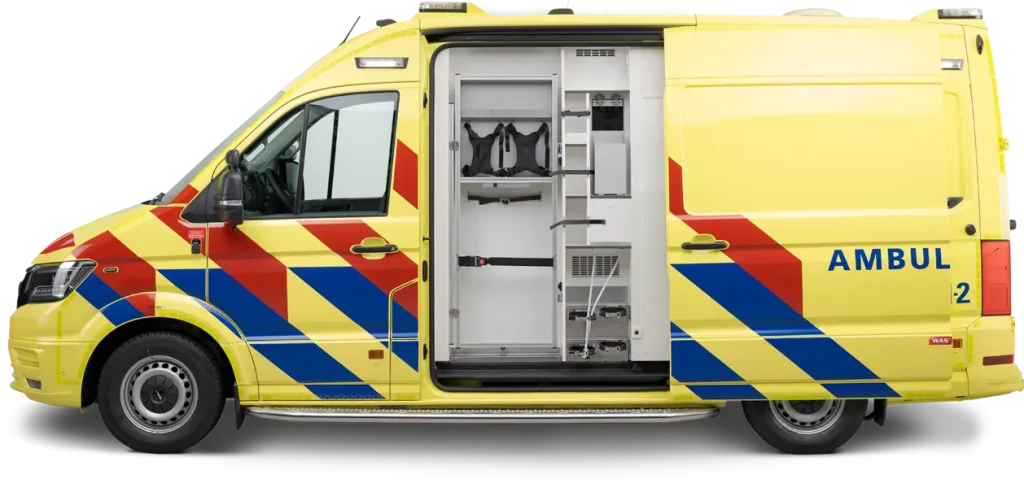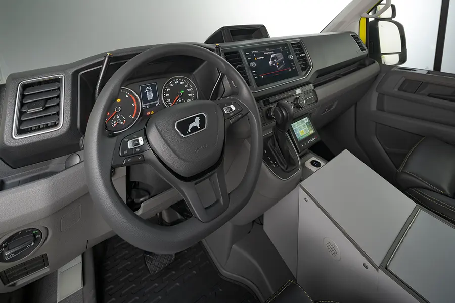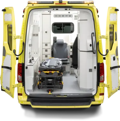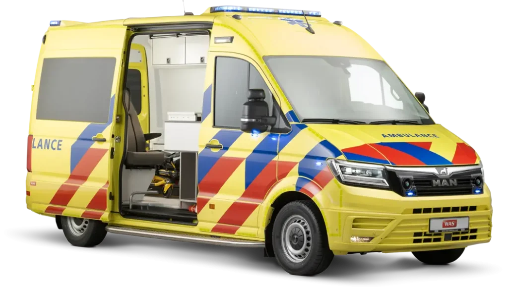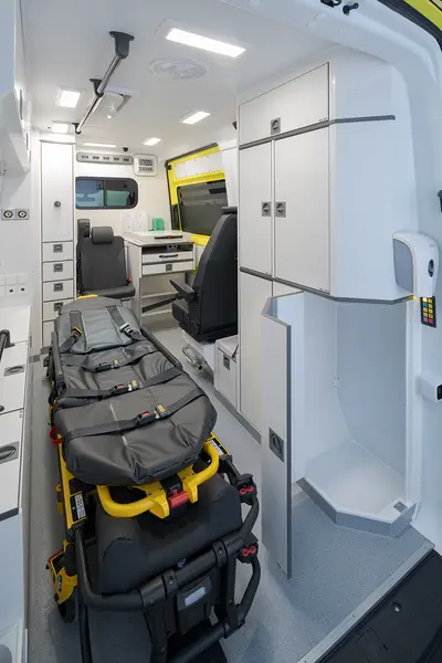 این آمبولانس با سطوح صاف و صیقلی و فضای داخلی مرتب خود، که امکان استفاده بهینه از فضا را فراهم می‌کند، بسیار چشمگیر است. تجهیزات پزشکی به طور ایمن در کابینت‌ها نگهداری می‌شوند تا بالاترین سطح بهداشت تضمین شود. بیمار در کانون توجه قرار دارد، در حالی که ایمنی امدادگر همیشه تضمین شده است. فضای ذخیره‌سازی مناسب در مکان‌های مناسب، که با حرکات امدادگر تداخل ندارد، راحتی را تضمین کرده و کار کارآمد را ممکن می‌سازد. نتیجه، یک محل کار دلپذیر است که هر آنچه را که نیاز دارید ارائه می‌دهد. خودروی پایه MAN TGE با ساختار مستحکم و راحتی بالای خود، بسیار چشمگیر است. راننده و امدادگر از یک محل کار جادار با صندلی‌های باکیفیت و روکش‌های چرمی شخصی‌سازی شده بهره‌مند می‌شوند. موتور قوی و اقتصادی و دوام تضمین شده، این خودرو را به انتخابی ایده‌آل تبدیل می‌کند.
